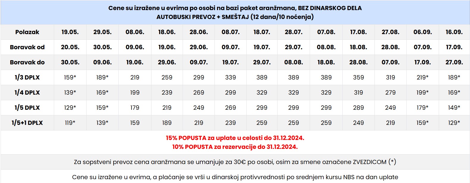 cena aranžmana se umanjuje za 30€ po osobi, osim za predsezonu i postsezonu (smene označene *) gde se u slučaju korišćenja sopstvenog prevoza plaća puna cena paket aranžmana.