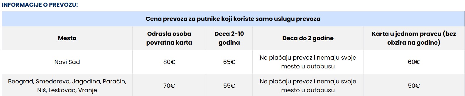 CENE SU IZRAŽENE PO OSOBI NA BAZI PAKET ARANŽMANA (smeštaj i prevoz) ZA POLASKE IZ BEOGRADA, NOVOG SADA I DUŽ AUTO PUTA.