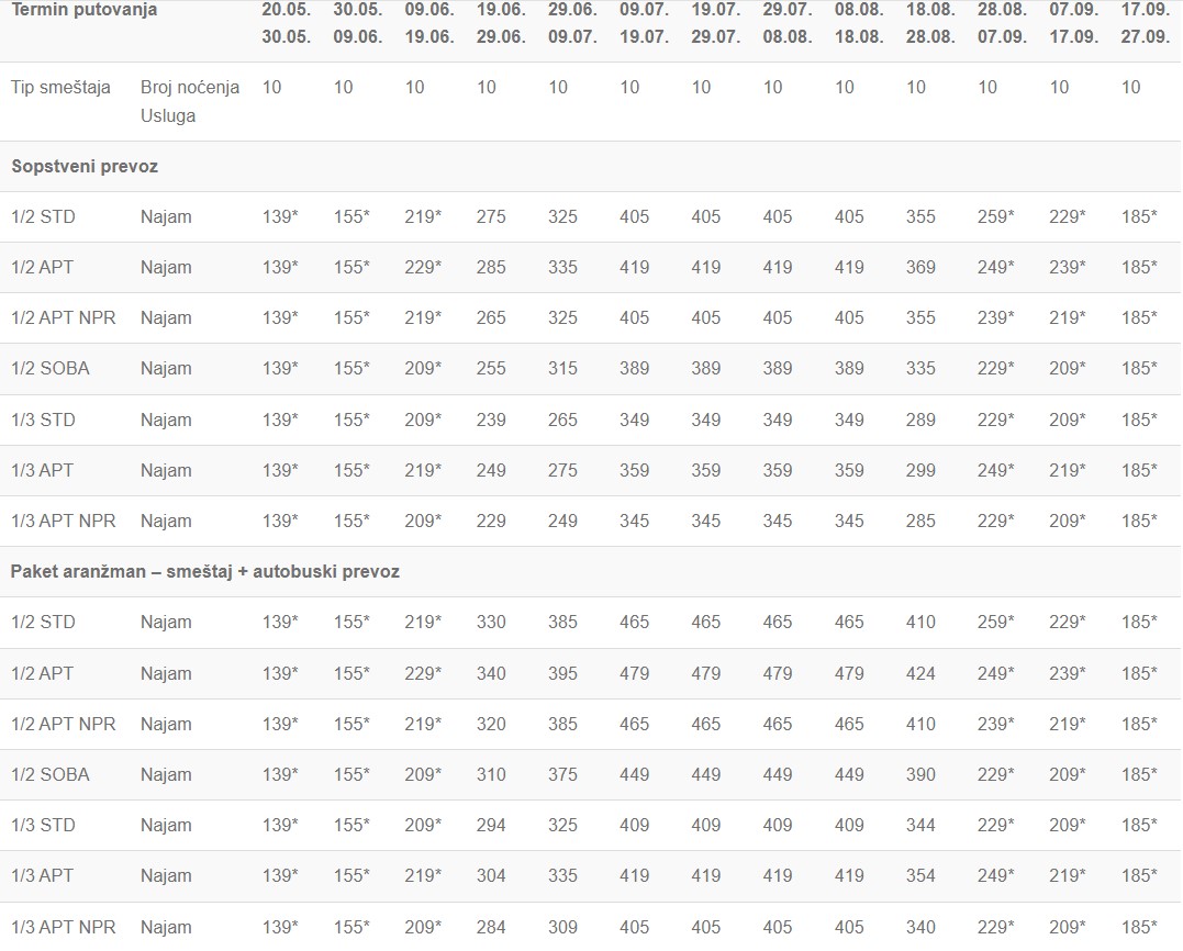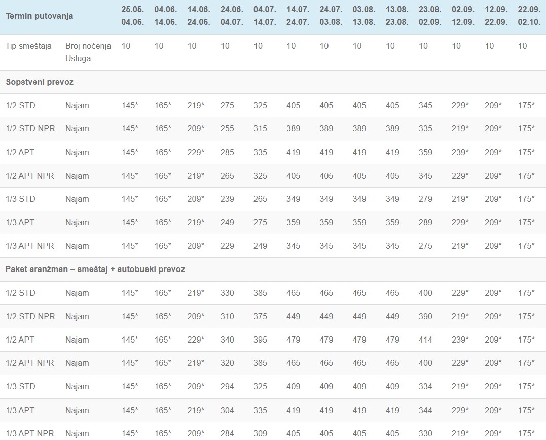 – U slučaju spajanja smena cena aranžmana se umanjuje za 30 € (osim kod smena označenih zvezdicom); kod smena gde je jedna sa zvezdicom a druga bez cena se umanjuje za 30 € od smene koja nije označena zvezdicom; u slučaju sopstvenog prevoza nema umanjenja cene.