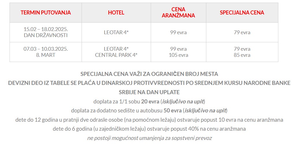 • transfer iz NOVOG SADA – doplata 25 evra / minimum 4 putnika, transfer iz VRŠCA – doplata 20 evra / minimum 8 putnika