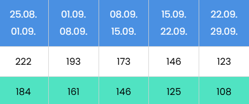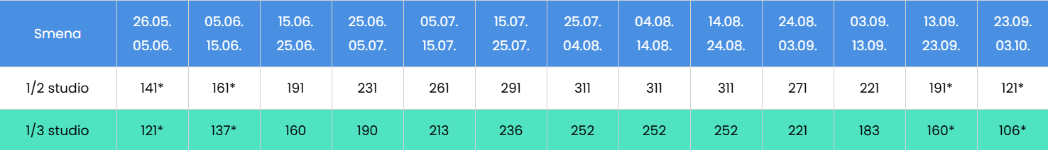 - U slučaju spajanja smena na organizovanom prevozu, cena aranžmana za drugu smenu se umanjuje za 20 eur po osobi osim za smene koje su u tabeli označene zvezdicom (*).