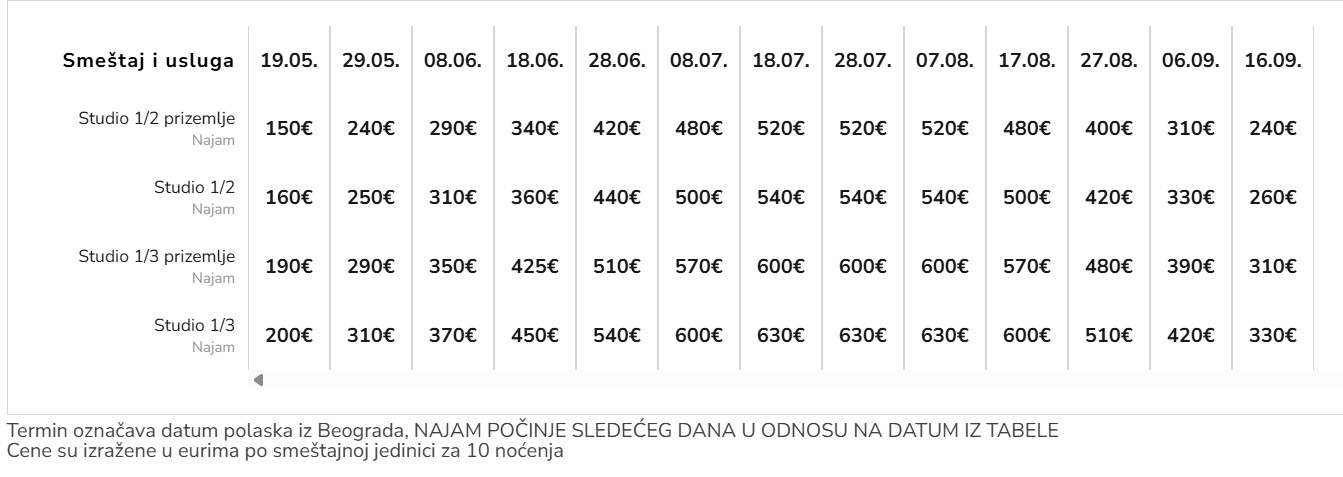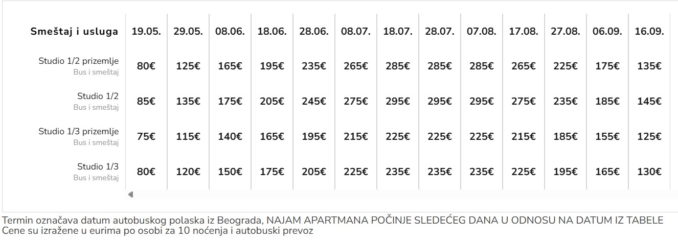 - prilikom spajanja smena prva smena se plaća prema cenovniku za autoubski prevoz (po osobi) a druga smena prema cenovniku za najam apartmana (ukupno)